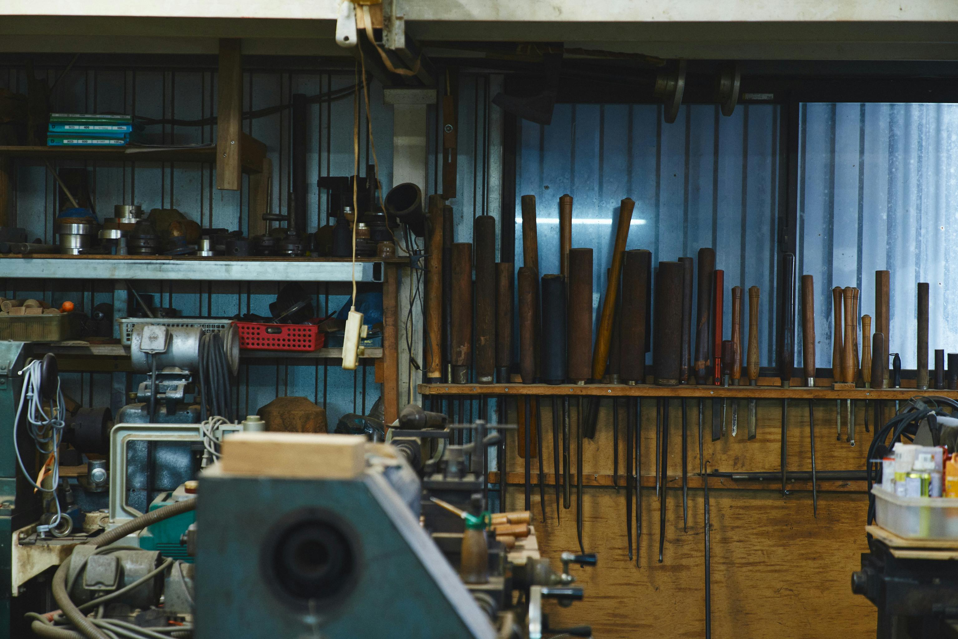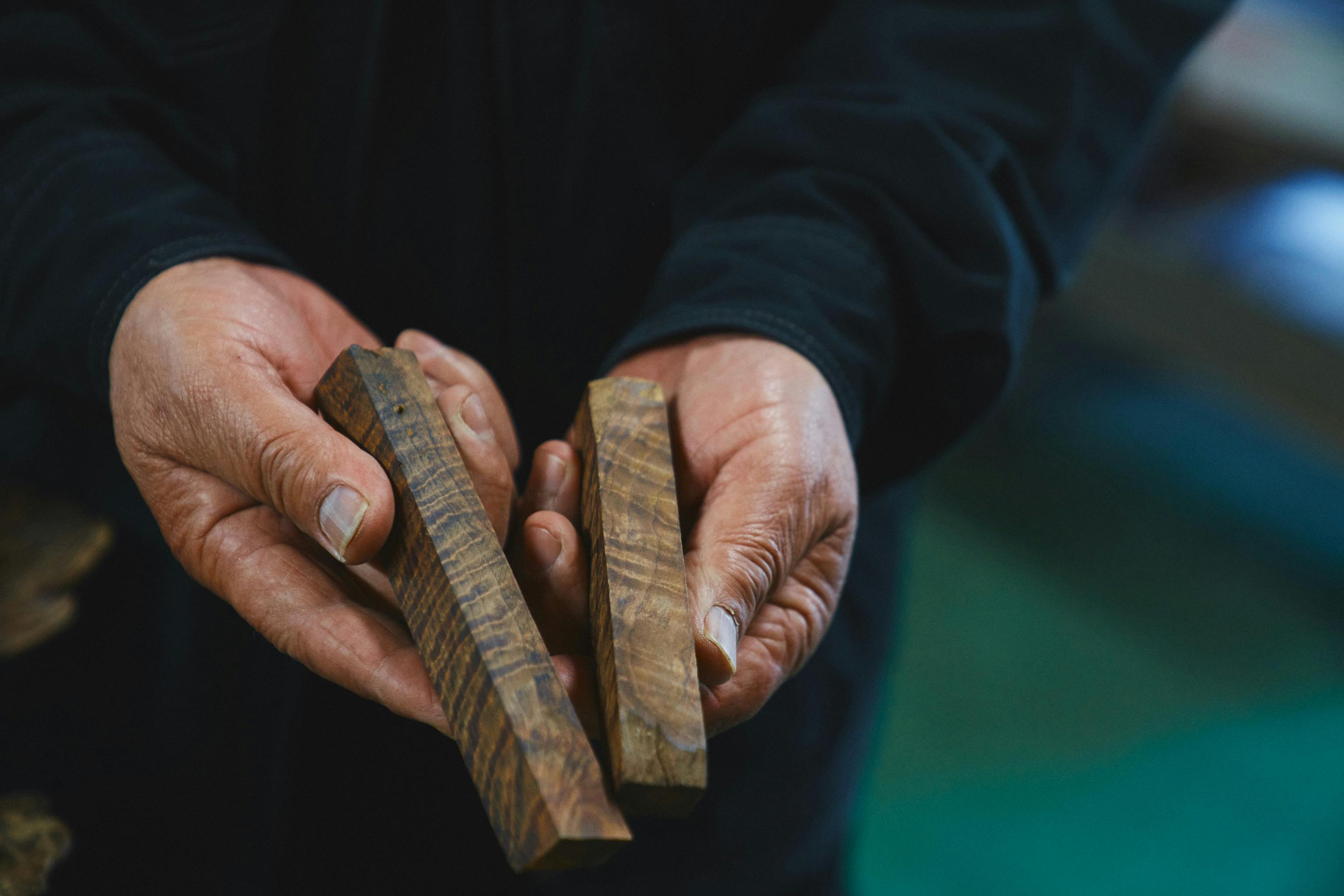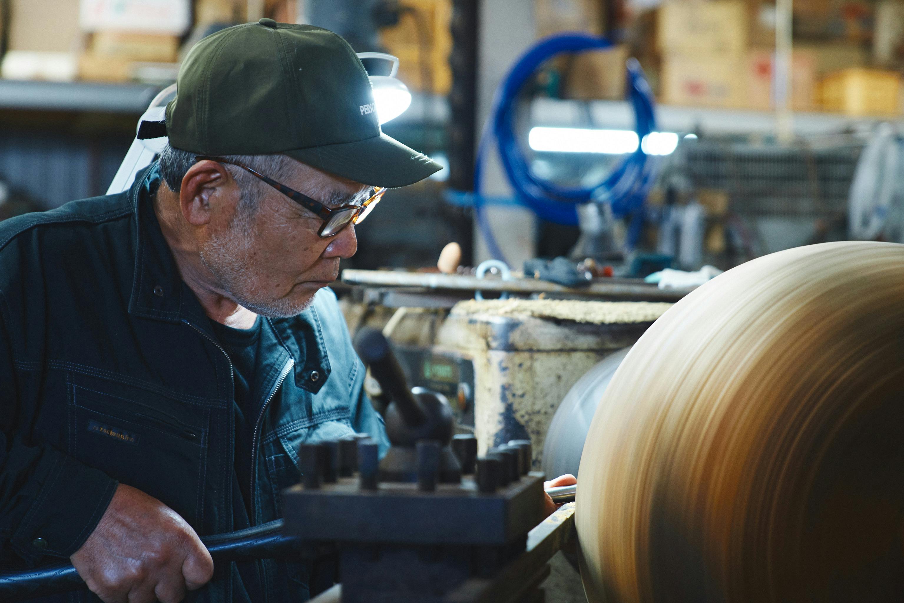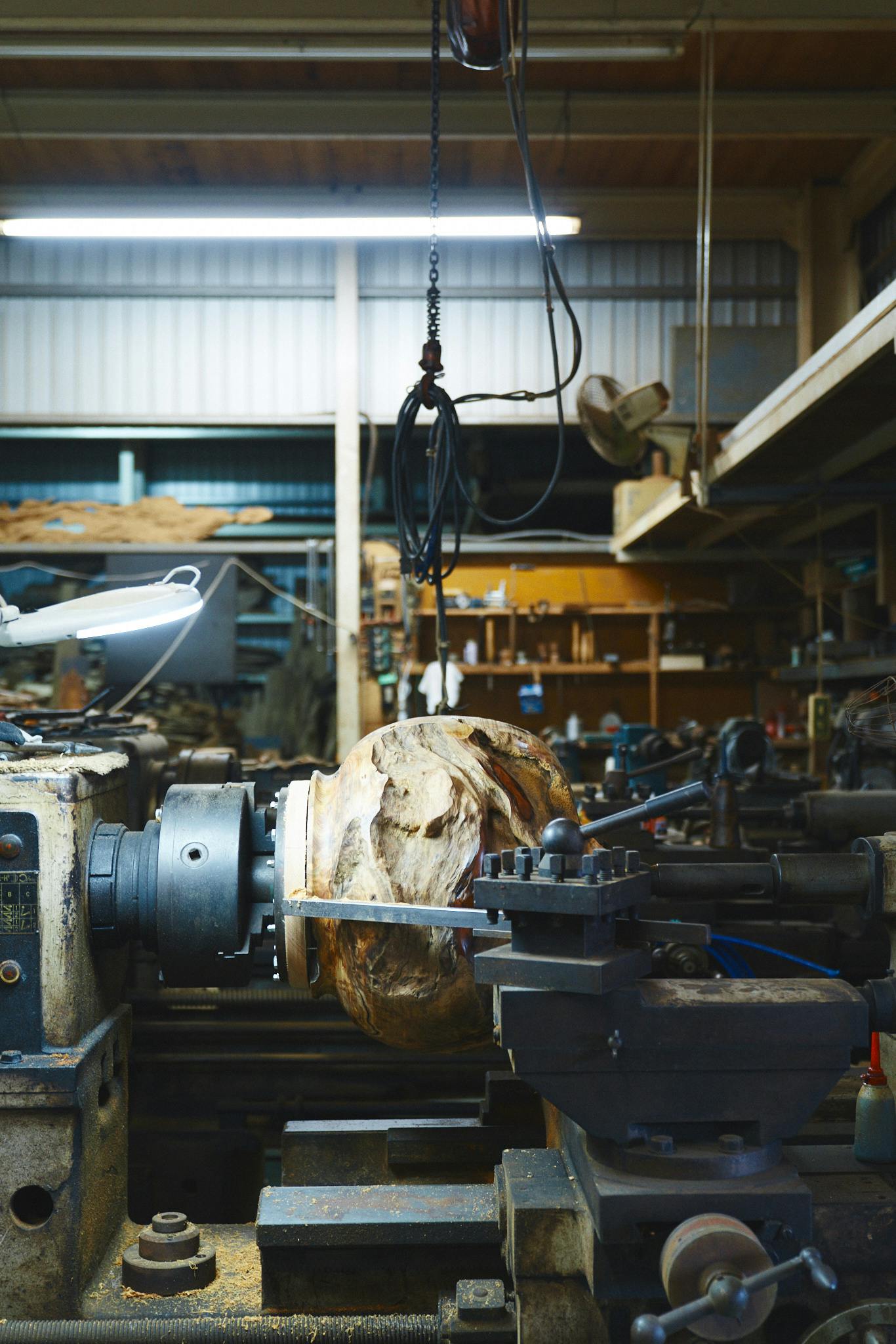 Yamada smiles as creases formed around his eyes. But speaking, his face suddenly becomes placid, like a calm sea. Then a chunk of Yakushima cedar fixed to his lathe starts rotating with a roaring noise. Yamada holds a chisel to carve the material in one go, wood shavings spinning off. Irregular grain can bounce the chisel backwards, so he must keep extreme tension. While concentrating on the senses of his hand, Yamada focuses on achieving the most beautiful possible forms.