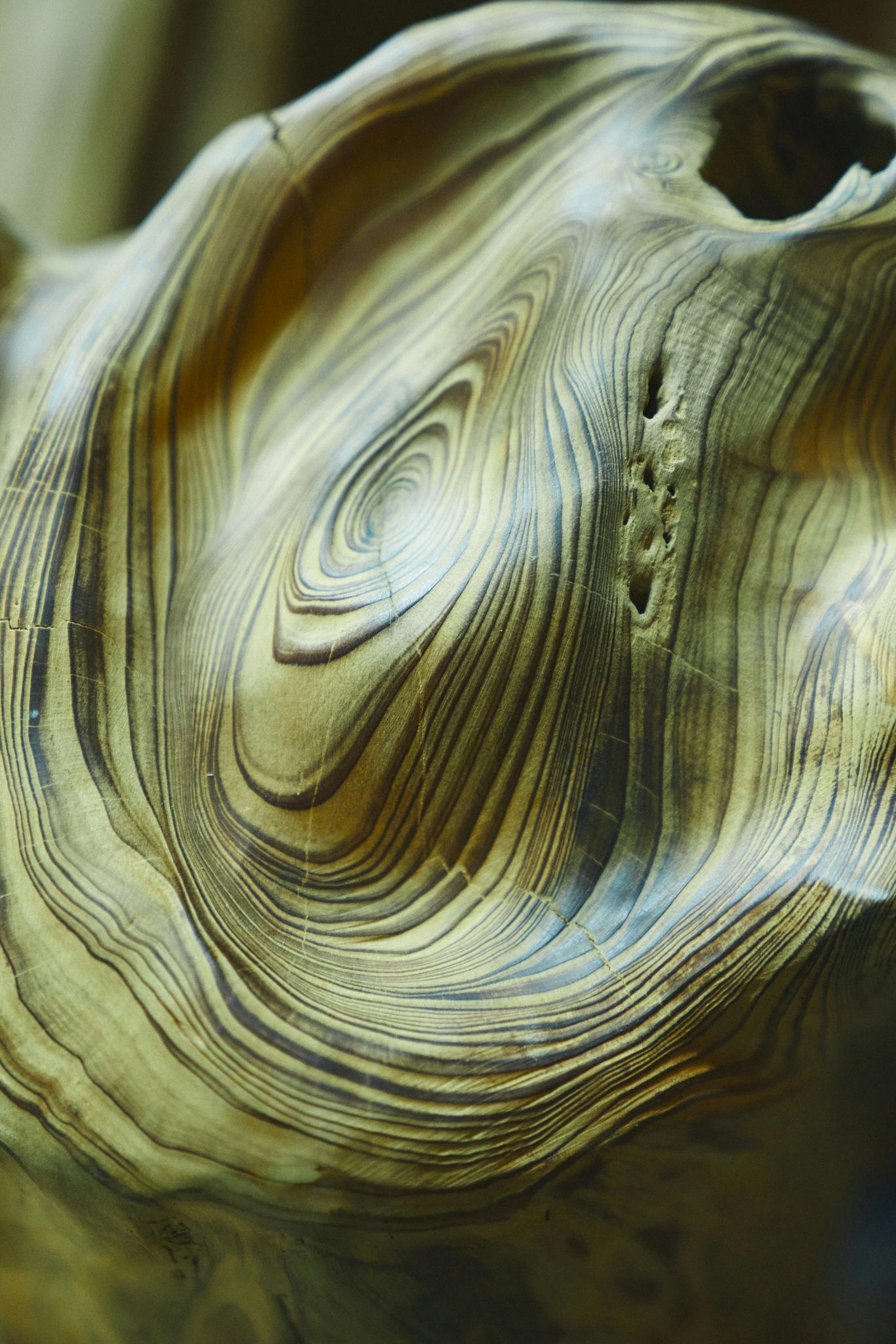 さっきまで⽬尻に皺を寄せて笑っていた⼭⽥さんの⽬が、すっと凪いだ海のように静かな眼差しに変わる。その瞬間、旋盤に固定した屋久杉の大きな塊が轟音とともに回り出し、山田さんが手にしたノミで木屑を飛ばしながら一気に削り出されていく。うねる杢目は加工に抗うように、ときに刃先を弾き返すこともあり、作業中は一切気を抜くことはできない。常に手元に集中しながら、どうしたら一番美しい姿に整えることができるかと思案を重ねる。